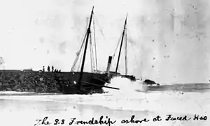 On 28 November 1912, Friendship left Tweed River bound for Sydney with a cargo of tallow. She had made this voyage numerous times with only one accident, the grounding the previous June. This time, however, she ran aground again at Tweed Heads at the end of South Wall. She sank, taking her cargo down with her, but there were no injuries or fatalities.[2]