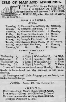 King Orry is of special interest, as she was the only ship in the Company's history to be built in Douglas. Although the John Winram yard gets the credit for her construction, it is probable that the building was supervised by Aitken of Liverpool, and the Douglas yard merely carried out the construction. Later in 1842, she was taken under tow by Mona's Isle to Glasgow, for her engines to be fitted by Robert Napier & Co.