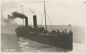 King Orry was built by R. Duncan & Co., at Port Glasgow in 1871, with engines by Rankin & Blackmore, and launched on Monday 27 March 1871. Length 260'; beam 29'4"; depth 14'7", King Orry had an original tonnage of 809 GRT, and this was later increased to 1,104. Her original speed was 15 knots.