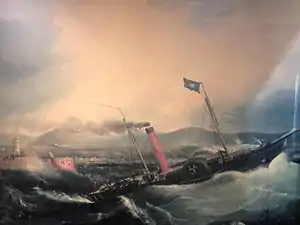 The seamanship of Capt. Gill again came to the fore on 20 November. Having discharged passengers and cargo at Douglas, he decided to put to sea foreseeing a dangerous south-easterly gale. Lieutenant Tudor, in charge of St. George, anchored in Douglas Bay but lost the vessel in the night when her cable parted and she went aground on the Conister Rock and broke up.[16] Through the efforts of Sir William Hillary, founder of the Royal National Lifeboat Institution, the crew of the St. George were saved.[17]