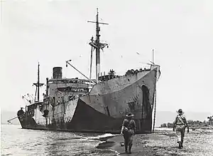 ![]() The wrecked Japanese ship Myoko Maru aground at Malahang in September 1943. | |