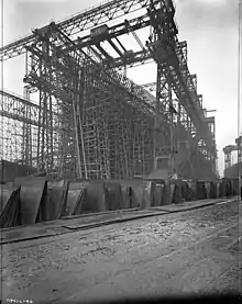 Construction of Olympic began three months before Titanic to ease pressures on the shipyard. Several years would pass before Britannic would be launched. To accommodate the construction of the class, Harland and Wolff upgraded their facility in Belfast; the most dramatic change was the combining of three slipways into two larger ones. Olympic and Titanic were constructed side by side.[15] Olympic's keel was laid on 16 December 1908 and she was launched on 20 October 1910, without having been christened beforehand.[7] By tradition, the White Star Line never christened any of their vessels and for the launch the hull was painted in a light grey colour for photographic purposes; a common practice of the day for the first ship in a new class, as it made the lines of the ship clearer in the black-and-white photographs.[19] Her launch was filmed both in black and white and in Kinemacolor, with only the black and white footage surviving.[20][21] The launches of Titanic and Britannic were later filmed too, though only Britannic's survived.[22] Her hull was repainted black following the launch.[5] The ship was then dry-docked for her fitting out.