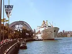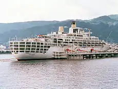From 1973, Oriana was converted to operate as a one class cruise ship and from 1981 until retirement in March 1986 was based in Sydney. After a layup of two months at No. 21 Pyrmont Wharf, Sydney, the ship was sold and moved to Osaka, Japan,[7] to become a floating hotel. The ship served as a floating museum at Beppu, Ōita, from 1987[7] but this venture was ultimately not successful, and she was subsequently sold to Chinese interests in 1995. The ship served as a floating hotel and tourist attraction in Shanghai until 2002, when she was moved to Dalian. In 2004 Oriana was damaged in a storm. Repairs proved to be unfeasible, so she was towed to a ship breakers yard and dismantled in 2005.[8]