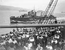 Taken up from trade as a troopship, Oronsay took part in the Norwegian Campaign, including Operation Alphabet, the secret evacuation of Narvik on 7 June 1940.[5] Almost immediately afterwards, she participated in Operation Aerial, the evacuation of British troops from western France. On 17 June 1940, she was anchored in the Loire Estuary, embarking troops being ferried out from St Nazaire in destroyers and small boats. During an air-raid, a German bomb landed on the ship's bridge, killing several people, destroying the chart, steering and wireless rooms and breaking the captain's leg.[6] Taking on survivors from RMS Lancastria which had sunk nearby, Captain Norman Savage steered the ship home with the aid of a pocket compass, a sextant and a sketch map.[7]