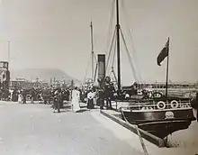 However, the Monarch had also sustained serious damage. Her stem was stoved in, and, had it not been for an extra-strong collision bulkhead, she may well also have foundered. On discharging the Peveril's crew and passenger, the Monarch moved across the harbour to the Red Pier, and then to the South Quay in order for repairs to be effected, where she attracted considerable attention from the public, with several thousand people reported to have visited the quay to view the damage.[12] A report in the Ramsey Courier; Tuesday 19 September 1899, stated that the Monarch's bow was covered by canvas in order to obscure the result of the impact, but the entirety could not be fully hidden. Damage could be seen in the shape of a hole, extending several feet below the waterline, as well as damage to her plating stretching back approximately 20 feet as a consequence of striking the Peveril's belting.[11]
