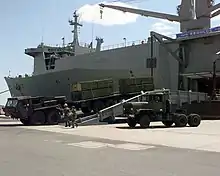![]() USNS Regulus (T-AKR-292) offloading a US Marine Logistic Vehicle System (LVS) at Auckland Port, Gladstone, Australia, during exercise Crocodile '99. | |