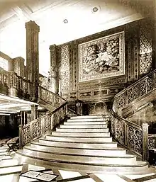Both ships were dubbed "The Riviera afloat". To carry the theme even further, sand was scattered in the outdoor swimming pools, creating a beach-like effect highlighted by multicolored umbrellas.[2] Rex was decorated in a classical style while the norm of the time was the Art Deco or the so-called "Liner Style" that had been premiered onboard the French Line's Ile de France in 1927, Rex's running mate Conte Di Savoia followed this rule, but also had rooms with classic style like her First Class Social Room also known as "Colonial Hall" . The ship's exterior design had followed the trend set by Germany's Bremen and Europa. Rex sported a long hull with a moderately raked bow and two working funnels with the colours of the Italian flag (red, white and green stripes), but still featured the old-type overhanging counter stern (also known as a fan tail) found on such liners as Olympic and Aquitania.