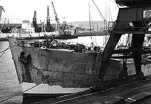 Postwar, Tobruk continued in Polish Government service. On 21 June 1946, the ship entered Gdynia in Poland for the first time.[13] After disbanding of Gdynia Ameryka Line, from 1951 the Tobruk became part of Polish Ocean Lines fleet.[14] In 1950 during a storm in the Bay of Biscay in order to prevent the ship from crashing into the local reefs the crew improvised a sail, saving the ship; this is the only known example of a modern bulk carrier using a sail.[15] In June 1967 Tobruk was given to other Polish state-owned operator, Polska Żegluga Morska (Polsteam), but was stricken already in November 1967.[16] She was scrapped at Gdynia by June 1968.[2]