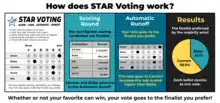 STAR voting is an electoral system for single-seat elections.[1][2] Variations also exist for multi-winner and proportional representation elections.[3] The name (an allusion to star ratings) stands for "Score then Automatic Runoff", referring to the fact that this system is a combination of score voting, to pick two finalists with the highest total scores, followed by an "automatic runoff" in which the finalist who is preferred on more ballots wins. It is a type of cardinal voting electoral system.