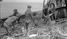 - They were pretty good sea boats, although very wet, there was a saying that they submerged at the Heads and surfaced down at Gabo Island. We worked mainly four on, four off. Turn to, to 'shoot away', pick up and store the catch and clean up. We worked bloody long hours. I think there were six deckies, four firemen, one engineer, one wireless operator and the master and mate. The galley was right aft with the mess room beneath. You would get your feed, climb down the hatchway to the mess room below. We would get a bucket of water from the galley to take to the forecastle where we bunked. By the time we got forward we would have only half a bucket of hot water to wash in but after a couple of days you didn’t worry about washing. You were wet through most of the time so it didn’t matter.[2]