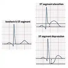 Illustration of ST segment elevation and depression - Flat, downsloping, or depressed ST segments may indicate coronary ischemia.