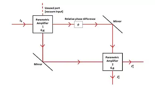 To briefly understand the benefit of using a parametric amplifier, a balanced SU(1,1) interferometer can be considered. Treating the input fields as quantum fields described by operators ,, the output quantum fields from a parametric amplifier can be written as:[1]
