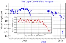 SU Aurigae is known to have a circumstellar protoplanetary disk surrounding it, which is typical of many T Tauri stars.[6] SU Aurigae's disk has a high inclination of 62° and is nearly perpendicular to the plane of sky, so orbiting protoplanets or comets may be the cause of why there are drops in the amount of light detected.[3] SU Aurigae's proper motion and distance is similar to AB Aurigae,[1] a better known pre-main-sequence star, meaning that the two may form a very wide binary system;[5] if not, they are still in the same star association.