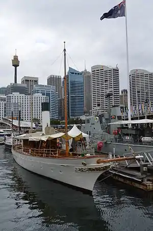 Built in 1900, Ena was commissioned by Thomas Dibbs, commodore of the Royal Sydney Yacht Squadron, as a replacement for his existing yacht of the same name.[1][2] The vessel was designed by Walter Reeks (1861–1925) a Sydney naval architect based in Pitt St, who had come out from the UK in 1885. It was constructed by Walter McFarlane Ford Jnr of W M Ford Boatbuilders at Berrys Bay, Sydney, and designed and built to the high standards maintained by both Reeks and Ford.[3] Its elegance and construction were recognised in a 1906 (American) Rudder magazine story on the vessel, and looking at it in retrospect, the steam yacht shows that Australian designers and shipbuilders could build luxury craft to the same quality and standards as in Europe or North America[1] in this period of classic yachts.