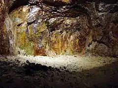 The caverns consist of three chambers connected by galleries. In the first chamber, information is presented about the history of the mine — in the 16th to 19th centuries an alum shale mine that was closed in 1850 but opened for sightseeing in 1914.[3] The historical background includes information about environmental radiation treatments formerly offered there until such treatments were found to be hazardous.