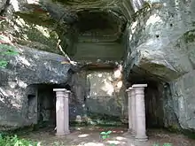 From the first century AD to the fifth century,[10] there was the Gallo-Roman settlement called vicus Saravus west of Saarbrücken's Halberg hill,[11] on the roads from Metz to Worms and from Trier to Strasbourg.[8] Since the first or second century AD,[8] a wooden bridge, later upgraded to stone,[7] connected vicus Saravus with the south-western bank of the Saar, today's St Arnual, where at least one Roman villa was located.[12] In the third century AD, a Mithras shrine was built in a cave in Halberg hill, on the eastern bank of the Saar river, next to today's old "Osthafen" harbor,[13] and a small Roman camp was constructed at the foot of Halberg hill[11] next to the river.[10]