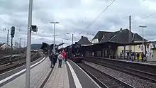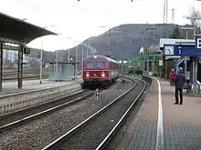 The first station on the territory of today's Saarlouis was opened in Fraulautern on 16 December 1858 during the construction of the Saar line.[5] However, Saarlouis was cut off from rail traffic, which hindered its economic development and the city fell behind the neighbouring communities of Dillingen and Bous. This initially led to the establishment of the Straßen- und Kleinbahnen im Kreis Saarlouis (Tramways and Light Railways in the District of Saarlouis). In addition, it was decided to construct a railway station in the current district of Roden.[6] Saarlouis station was opened on the present site on 19 December 1912.[7] From the mid-1960s the station was connected to the electrical network of Deutsche Bundesbahn after the station was renamed to Saarlouis Hauptbahnhof ("main station", although there are no other stations in Saarlouis). Until 2002, InterRegio services also stopped in Saarlouis; since then the station has only been served by regional services.