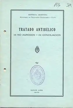 The Anti-war Treaty of Non-aggression and Conciliation (also known as Saavedra Lamas Treaty) was an inter-American treaty signed in Rio de Janeiro on October 10, 1933. It was the brain-child of Carlos Saavedra Lamas, who was Argentinian Minister of Foreign Affairs at the time the treaty was concluded. It was signed by representatives of Argentina, Brazil, Chile, Mexico, Paraguay and Uruguay. The US government acceded to the treaty on August 10, 1934. The treaty went into effect on November 13, 1935. It was registered in League of Nations Treaty Series on November 28, 1935.[1]