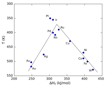 The figure on the right shows a volcano plot for the decomposition of formic acid using different transition metals as catalysts.[5] In this case, the heat of formation (ΔHf) of the metal formate salt was used for the x axis because studies showed that the reaction intermediate was a surface formate. For the y axis, the temperature at which the reaction reaches a specific rate was used (the y axis is plotted in reverse to preserve the conventional "volcano" shape). At low values of ΔHf, the reaction is slow (in other words, requires higher temperatures) because the rate of adsorption is slow and rate-limiting. At high values of ΔHf, desorption becomes the rate-limiting step. The maximum rate, which is observed for the platinum group metals in this case, requires intermediate values of ΔHf, with the rate being a combination of the rate of adsorption and the rate of desorption.[3]