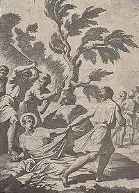He was martyred during the reign of Valentinian and Valens, in the consulship of Modestus and Arintheus, i.e. 372.[8] His remains were taken and hidden by the Christians until they could be sent for safe keeping to the Roman Empire.[9] Here they were received by Bishop Ascholius of Thessalonica.