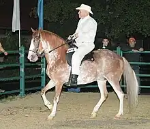 The term "sabino" is also used for horses who do not carry SB-1, but have white leg markings above the knees and hocks with jagged margins, wide blazes, and belly spots or roaning. In some cases, the term is defined even more broadly, to include white spots on the lower lip or chin, distal white patches on the legs, or "pointy" leg markings.[17] The “dominant white” alleles W5, W8, W10, W15, and W19 are particularly noted for producing sabino-type markings.[18][19]