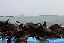 Saccharina japonica is a marine species of the Phaeophyceae (brown algae) class, a type of kelp or seaweed, which is extensively cultivated on ropes between the seas of China, Japan and Korea.[1] It has the common name sweet kelp.[2] It is widely eaten in East Asia.[3] A commercially important species, S. japonica is also called ma-konbu (真昆布) in Japanese, dasima (다시마) in Korean and hǎidài (海带) in Chinese.[3] Large harvests are produced by rope cultivation which is a simple method of growing seaweeds by attaching them to floating ropes in the ocean.[1][4]