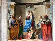 Early examples such as the Bellini illustrated rarely show actual "conversation" or much interaction, though this may be seen from the 16th century on,[13] as in the Madonna and Child with Saints Luke and Catherine of Alexandria by Titian. In the first examples the setting is normally architectural, loosely representing heaven, but also, until Titian's Pesaro Altarpiece (begun 1519), continuing the architecture of the architectural frame and therefore that of the original church setting for which it was painted. This was a radical rethink of the type, apparently set outside some temple portico with large soaring columns, viewed obliquely. The Virgin and Child are no longer at the centre of the composition, but to the right of the picture space.[14]
