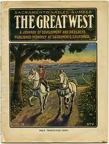 In 1902, the association published a booster periodical called the Wednesday Press, which was renamed The Great West in October 1907 by manager turned editor W.A. Beard. As a booster, he tracked Sacramento's progress from what he called "one of the most backward and unprogressive cities on the entire Pacific Coast" to one in which "the population ... business ... property values have increased and every prominent interest in the city has been infused with life."[34] He signaled the dawn of a new era with headlines that alluded to science, "Substantial Evidence of Sacramento's New Growth", and faith, "Sacramento's New Awakening".[35] At this, he'd been a natural since his days as secretary-manager:
