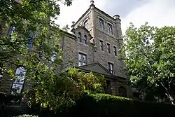 English immigrant Samuel Hannaford began his Cincinnati architectural practice in 1858 in partnership with Edwin Anderson. This partnership endured until 1870,[2]: 10 shortly after Sacred Heart Academy was constructed in 1868.[1] The building was originally a massive house; its first resident, William C. Neff, desired that his home be patterned after the English Kenilworth Castle.[3] Neff's house was one of numerous residences that Hannaford designed for Cincinnati's wealthy, although it predates most others; Hannaford became prominent in Cincinnati and the surrounding region only after designing Music Hall near downtown in 1877,[2]: 11 and the Gilded Age at the end of the nineteenth century saw numerous Hannaford houses being constructed in prestigious neighborhoods such as Walnut Hills and Avondale.[2]: 10 Neff only lived in his great house for a few years; in 1876, it was acquired by the Academy of the Sacred Heart, which needed to leave its previous location on Grandin Road. The Academy used the property for nearly a century until closing entirely in 1970,[3] but it had remained active among Catholic schools until shortly before the end; in the late 1960s, it became a founding member of the Girls Greater Cincinnati League.[4] During its decades in the building, the school arranged for the construction of multiple additions to the original structure.[3]