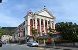 The church was popularly known as "the Basilica", because of its palladian architectural style.[2] It was designated as the cathedral of Wellington in 1984 after earthquake strengthening and the addition of the Blessed Sacrament chapel, foyer, sacristy, courtyard, hall (called Connolly Hall) and piazza. The parish of Thorndon was administered by the Society of Mary (Marist Fathers) for eighty-five years until 1935,[3] although secular or diocesan clergy were also stationed there.[4] The founder of the see, Bishop Viard, and the first two archbishops, Redwood and O'Shea, were also members of the Society of Mary. Since 1954 all the archbishops and the resident clergy of the cathedral have been secular clergy.[3]