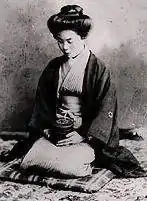 Sadako appears as a young woman whose face is hidden under her long black hair, and she wears a white dress that has water stains on it that is also frayed at the end. This appearance is typical of yūrei. Specifically, Sadako is a type of yūrei known as an onryō, bound by a desire for vengeance. In Sadako 3D, Sadako appears as her human self while still displaying traits of an onryō, in addition to the standard yūrei appearance. Ring: Kanzenban was the only rendition that differs from a traditional yūrei appearance. She is shown similarly as a young woman, yet her hair barely covers her face, and is frequently portrayed nude as opposed to a white garment. Sadako is also an amalgamation of two famous Japanese ghosts, Oiwa and Okiku. From Oiwa, Sadako takes the single, misshapen eye. From Okiku, the style of murder, of being thrown down a well and then having the ghost rise from the well to seek vengeance.[3]