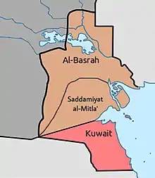 Saddamiyat al-Mitla' (Arabic: قضاء صدامية المطلاع) was a district in Basrah Governorate during the Iraqi occupation of Kuwait 1990–1991. The formation of the district was announced on August 28, 1990.[1][2] The name sought to honour the Iraqi president Saddam Hussein.[2] Whilst the rest of Kuwait was annexed as the 19th governorate of Iraq, the strategic northern parts of Kuwait was annexed as the Saddamiyat al-Mitla' district as part of the Basrah Governorate.[1]