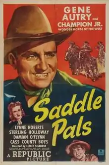 Saddle Pals is a 1947 American Western film directed by Lesley Selander and written by Robert Creighton Williams and Jerry Sackheim. The film stars Gene Autry, Lynne Roberts, Sterling Holloway, Irving Bacon, Damian O'Flynn and Charles Arnt.[1][2][3] The film was released on June 6, 1947, by Republic Pictures.