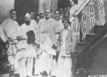 Prafulla Chandra Ray, Ashrafuddin Ahmad Chowdhury, Netaji Subhas Bose and poet Kazi Nazrul Islam at Sadhana Aushadhalaya (1924)
