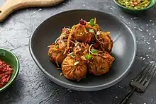 Sadheko momo or Sandheko momo is a Nepalese dish where it fuses the momos with various spices and seasoning.[1] To make this dish, the momos are first pan fried before adding a mixture of spices, herbs, tomato, sliced onions, garlic, coriander, chillies, salt and a sprinkle of lemon.[2][3][4]