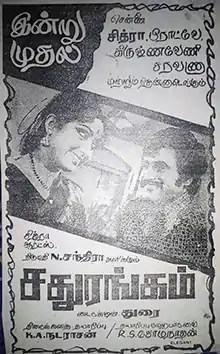 Sadhurangam (transl. Chess) is a 1978 Indian Tamil-language film directed by Durai. The film stars Rajinikanth, Srikanth, Jayachitra and Prameela, with Thengai Srinivasan, V. K. Ramasamy and Pandari Bai in supporting roles. It is based on Visu's play Bharatha Matharkku Jai.[1] It is a partially lost film.[2]