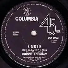 "Sadie (The Cleaning Lady)" was Australian pop singer Johnny Farnham's first solo single.[1] The novelty song was released in November 1967 and was No. 1 on the Go-Set National Singles Charts for five weeks in early 1968[2][3] (six weeks on the Australian charts in 1968 based on the Kent Music Report).[4] It was the largest-selling single in Australia by an Australian artist in the 1960s.[1][5] "Sadie" sold approximately 183,000 copies in Australia and was the highest-selling Australian single until "Up There Cazaly" was released in 1979.[6][7][8] It was also released in New Zealand, Denmark and Germany.[9] The B-side, "In My Room", was written by Farnham.[10] The A-side's label includes the acknowledgement "Vacuum cleaner solo: Mr. Jolly".[lower-alpha 1]