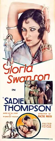 Sadie Thompson is a 1928 American silent drama film that tells the story of a "fallen woman" who comes to Pago Pago to start a new life, but encounters a zealous missionary who wants to force her back to her former life in San Francisco. The film stars Gloria Swanson, Lionel Barrymore, and Raoul Walsh, and it is one of Swanson's more successful films.