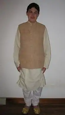 The sadri is a sleeveless-vest jacket, traditionally worn over achkan, angarkha, qameez and kurta by men.[5] It was historically worn by the peasant class and was decorated with various styles of folk embroidery for festive occasions.[6][7] It is part of everyday wear for men and it is also popular among the political class throughout South Asia.[8] In the winter, the sadri is especially worn as it keeps the wearer warm.[9]