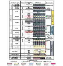 Saudi Arabia covers a large part of the Arabian Basin which is the primary producer of oil and gas. The basement structures beneath the Arabian Basin have controlled sediment deposition and structural growth of the basin. The main petroleum system of the Safaniya reservoir is the Mesozoic Petroleum System. The Mesozoic Petroleum System can be divided into two smaller petroleum systems, the Jurassic Petroleum System and Cretaceous Petroleum System. These small systems have generated hydrocarbons from the Jurassic to Cretaceous time period and largely contributed to the oil and gas production in the world's largest offshore field in Saudi Arabia the Safaniya Fields. The Jurassic Petroleum System consists of the Tuwaiq Mountain and Hanifa formations which are thick laminated organic rich lime mudstone units from the Jurassic period and contain a type II kerogen that has excellent source rock potential. The carbon isotope ratios between the oils (avg. δ 13C = - 26.6‰) and the kerogen (avg. δ 13C = - 26.4‰) and bitumen (avg. δ 13C = - 27.1‰) [8] The typical seal rock in the Mesozoic petroleum system that separates the Jurassic oils from mixing with the Cretaceous oils is a permeable evaporites anhydrite with a thickness reaching up to 287 m. The seal is not well developed along the eastern and northeastern part of Saudi Arabia. This allows Jurassic oils to mix with Cretaceous oils and causes the production of Cretaceous oils with a Jurassic oils to be limited to the eastern and northeastern part of Saudi Arabia. The Cretaceous Petroleum System consists of the main reservoir in the Safaniya fields, the Safaniya member. The Safaniya member is a thick sequence of sandstone, siltstone and shale with thin intervals of limestone, coal and varying amounts of ironstone. The Mauddud Formation is intra-formational shales and tight carbonates that seals the reservoirs within the Safaniya Formation.[9]