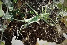 Saga hellenica is a large species of bush cricket or katydid in the family Tettigoniidae. It is endemic to the Balkans, living in Albania, North Macedonia, Greece (without Eastern Macedonia and Thrace) and in the past also in western Bulgaria, where it occurred on shrubs and more rarely in the grass in open stony terrains and light xerophytic forests.[1]
