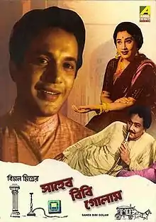 Saheb Bibi Golam is a 1956 Bengali film directed by Kartik Chatterjee.[4][5][6] It is based on a Bengali novelist Bimal Mitra's 1953 novel of the same name. The film explores the tragic fall of feudalism in Bengal during the British Raj. The title of the movie and the story is a reference to the plot simultaneously exploring a platonic relationship between a beautiful, forlorn wife of an aristocrat and a career-driven clerk. The film stars Sumitra Devi, Uttam Kumar, Chhabi Biswas, Pahari Sanyal.[7][8]