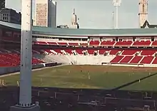 The proposed seating expansion to accommodate Major League Baseball was revised by HOK Sport to preserve the aesthetic of the roof, which would now be kept and raised to cover a third deck. In this new design, less seating would be built on the third deck, and instead a new right field seating structure would be built in front of the Exchange Street parking ramp.[57] In addition, expanded bleachers would be added in right field that could later be converted to permanent seating. Capacity after this expansion would increase from 19,500 to 41,530 at a cost of $30 million, but unlike the earlier design would take longer than a single offseason to complete.[58] Prior to the 1990 season, 1,400 bleacher seats and a standing-room only area within the third-base mezzanine were added at a cost of $1.34 million, increasing the stadium's capacity from 19,500 to 21,050.[59][60]