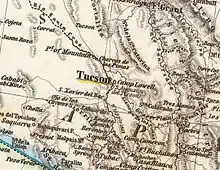 An 1870 map of Arizona shows an "Indian Village" just north of Sahuarita.[6] The earliest known reference to the town can be found on a German map from 1875, which labels the town "Sahuarito".[7] The first known US map to list the town came in 1879, by the US Department of Interior, calling the town "Saurita".[8] The Saurita town name would continue to be found on successive maps of 1880[9] and 1890.[10] Finally, a 1925 map of "Auto Trails" (e.g. roadways) of Arizona and New Mexico lists "Continental" instead of Sahuarita. The roadway at the time was an "improved road", one step inferior to a "paved road", laying the route to what today is called the Old Nogales Highway.[11]