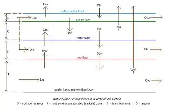 The agricultural water balances are calculated for each soil reservoir separately as shown in the article Hydrology (agriculture). The excess water leaving one reservoir is converted into incoming water for the next reservoir. The three soil reservoirs can be assigned different thickness and storage coefficients, to be given as input data. When, in a particular situation the transition zone or the aquifer is not present, they must be given a minimum thickness of 0.1 m.