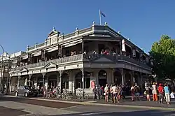 The Freemasons' Hotel, was constructed in 1901–1903. It replaced the hotel that was originally constructed on the site in 1854 for Nicholas Paterson and Anthony Cornish.[1] In 1901, James Gallop purchased the Freemasons' Hotel property[2] and commissioned architect Frederick William Burwell to design a new hotel for the site.[3] Burwell also designed the Central Chambers, Victoria Pavilion, Fowler's Warehouse, Owston's Buildings and Marmion House.[4] The construction was undertaken by William Reynolds and was carried out in stages so that the hotel could continue to trade. In the 1920s, a first floor wing was added to the western side of the hotel. In 1955, the veranda and balcony was removed and replaced with a suspended awning.