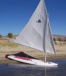 The Sailfish sailboat is a small, hollow body, board-boat style sailing dinghy. The design is a shallow draft, sit-upon hull carrying a crab claw sail mounted to an un-stayed mast. This style sailboat is sometimes referred to as a "wet boat" because, with its minimal freeboard, the sailor often gets splashed by spray as the boat moves across the water. This flat top was known in some coves as the "ironing board of the ocean."