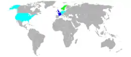 ![]() Map of Participating Sailing Countries at the 1908 Summer Olympics ● Green = Participating for the first time ● Blue = Participating ● Light Blue = Have previously participated |