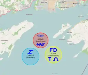 The distance from the Portsmouth Olympic Harbour to course area Bravo (red) was about 5 nmi (9.3 km) From there it was another 5 nmi (9.3 km) to the course area's Alpha (yellow) and Charlie (blue). This however ensured wind conditions without local effects.