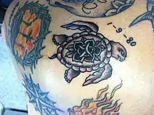 A specific style of "old school" tattoos became popular among sailors in the 1930s-1940s, with traditional symbols and other maritime-inspired images in simple black lines with color touches.[31] This style was further popularized in subsequent decades, including for people who weren't sailors, through the work of prolific tattoo artists including Norman Collins (known as Sailor Jerry) in Honolulu,[32] and Lyle Tuttle in San Francisco, California.[31] In particular, Collins reworked 1920-30s designs with influences from Japanese artists, creating stylized images that appealed to a wider audience in the 1950s-60s.[33]